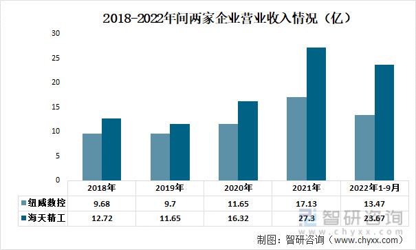 从近年来两家企业的营业收入情况来看,海天精工从2018年的12.72亿上升至2021年的27.3亿,纽威数控从2018年的9.68亿上升至2021年的17.13亿。截至2022年Q3季度,海天精工和纽威数控营业收入为23.67亿和13.47亿。