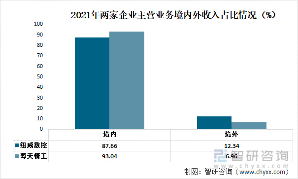 从2021年两家企业主营业务境内外收入占比情况来看,纽威数控境外收入占比较高,为12.34%,高于海天精工的6.96%。