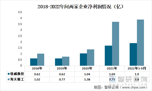 从两家企业的净利润情况来看,海天精工从2018年的1.02亿上升至2021年的3.71亿元,而纽威数控从2018年的0.62亿上升至2021年的1.69亿。截至2022年Q3季度,纽威数控和海天精工净利润为1.9亿和3.9亿。
