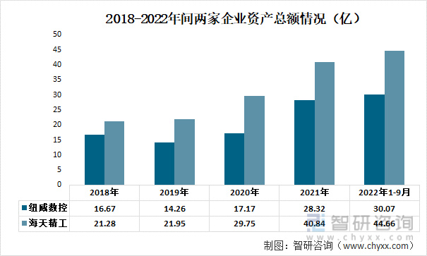 从近年来两家企业的资产总额情况来看,呈现逐年上升的态势,且海天精工的资产规模要大于纽威数控。2021年海天精工的资产总额为40.84亿,纽威数控为28.32亿。截至2022年Q3季度,海天精工的资产总额达到44.66亿,超过纽威数控。