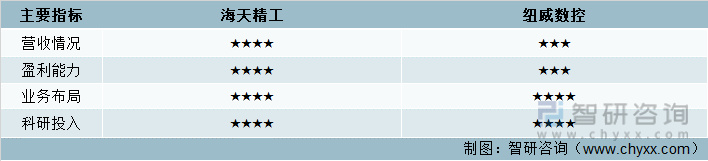 从主要指标的对比情况来看,海天精工在营收情况和盈利能力方面超过纽威数控,而在业务布局和科研投入方面两家企业较为接近。两家企业都是中国立式数控机床行业的核心企业,在整个市场具备较强的领导力。